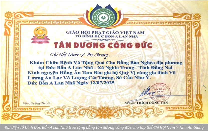 Thông qua công tác thiện nguyện, Đại diện chùa Thượng Tọa Thích Đồng Tấn phó Ban Trị Sự Tỉnh Bình Phước hiện nay (thuộc tỉnh Đồng Nai) cũng là Trụ trì chùa Đức Bổn A Lan Nhã, gửi lời cảm ơn sâu sắc và đánh giá cao về việc công tác thiện nguyện và trao tặng bằng tuyên dương công đức cho Ban đại diện Phía Nam và các Chi hội cùng tham gia công tác thiện nguyện.